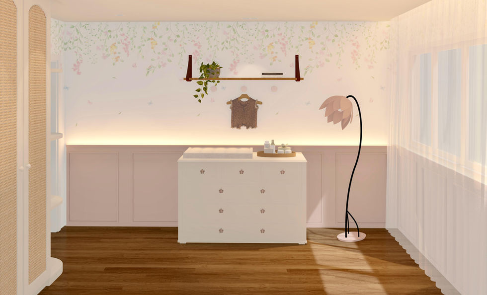 Este projeto foi desenvolvido integralmente por mim, desde a concepção do design até a modelagem 3D e renderização. O objetivo era criar um ambiente aconchegante, delicado e funcional, equilibrando estética e conforto para o bebê e sua família.
